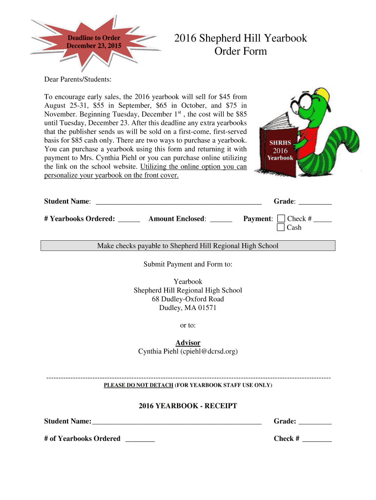 2016 Shepherd Hill Yearbook Order Form Deadline to Order December 23, 2015, Dear Parents/Students: To encourage early sales, the 2016 yearbook will sell for $45 from August 2531, $55 in September,