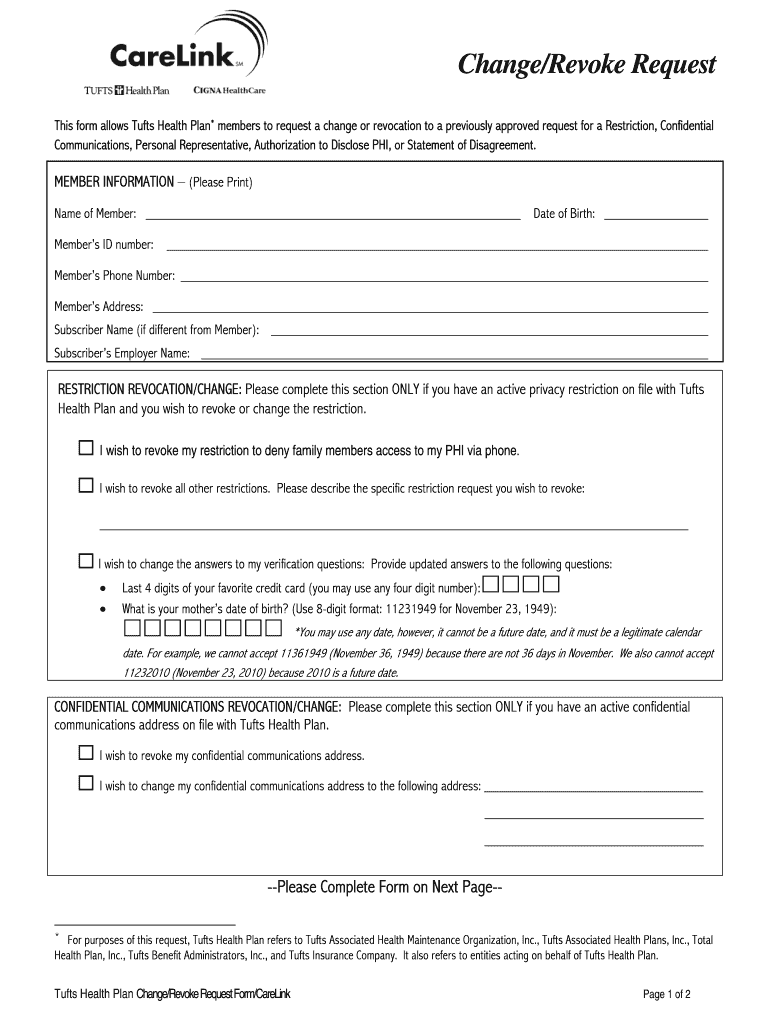 Change/Revoke Request This form allows Tufts Health Plan* members to request a change or revocation to a previously approved request for a Restriction, Confidential Communications, Personal Representative,