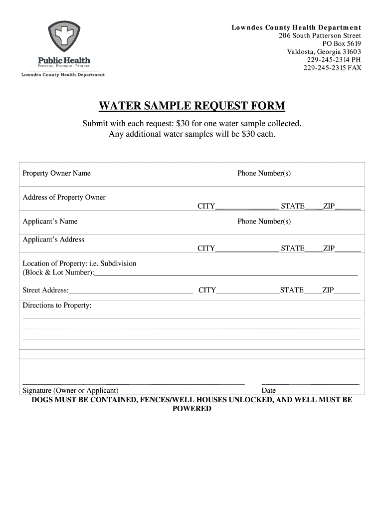 Lowndes County Health Department 206 South Patterson Street PO Box 5619 Valdosta, Georgia 31603 2292452314 PH 2292452315 FAX WATER SAMPLE REQUEST FORM