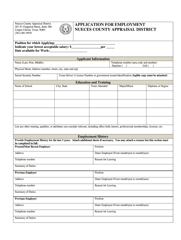 Get the free Nueces County Appraisal District APPLICATION FOR EMPLOYMENT