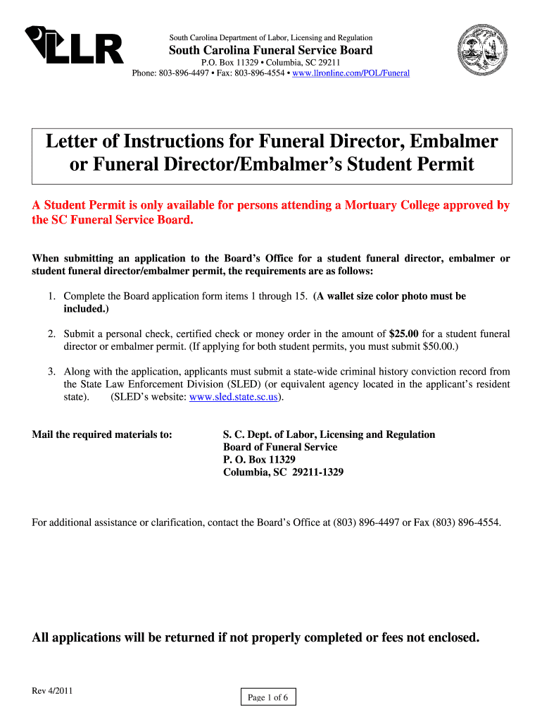 Get the free Instruction letter fd embalmer Student application rev 4-2011 - llr sc