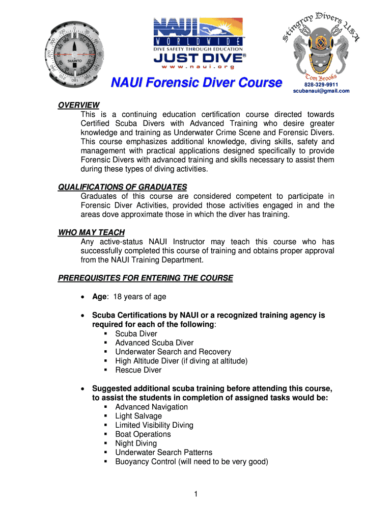 NAZI Forensic Diver Course 8283299911 scubanaui gmail.com OVERVIEW This is a continuing education certification course directed towards Certified Scuba Divers with Advanced Training who desire greater