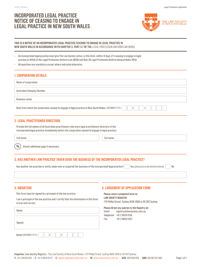 Legal Profession Legislation LS1174 Version 1 INCORPORATED LEGAL PRACTICE NOTICE OF CEASING TO ENGAGE IN LEGAL PRACTICE IN NEW SOUTH WALES THIS IS A NOTICE OF AN INCORPORATED LEGAL PRACTICE CEASING