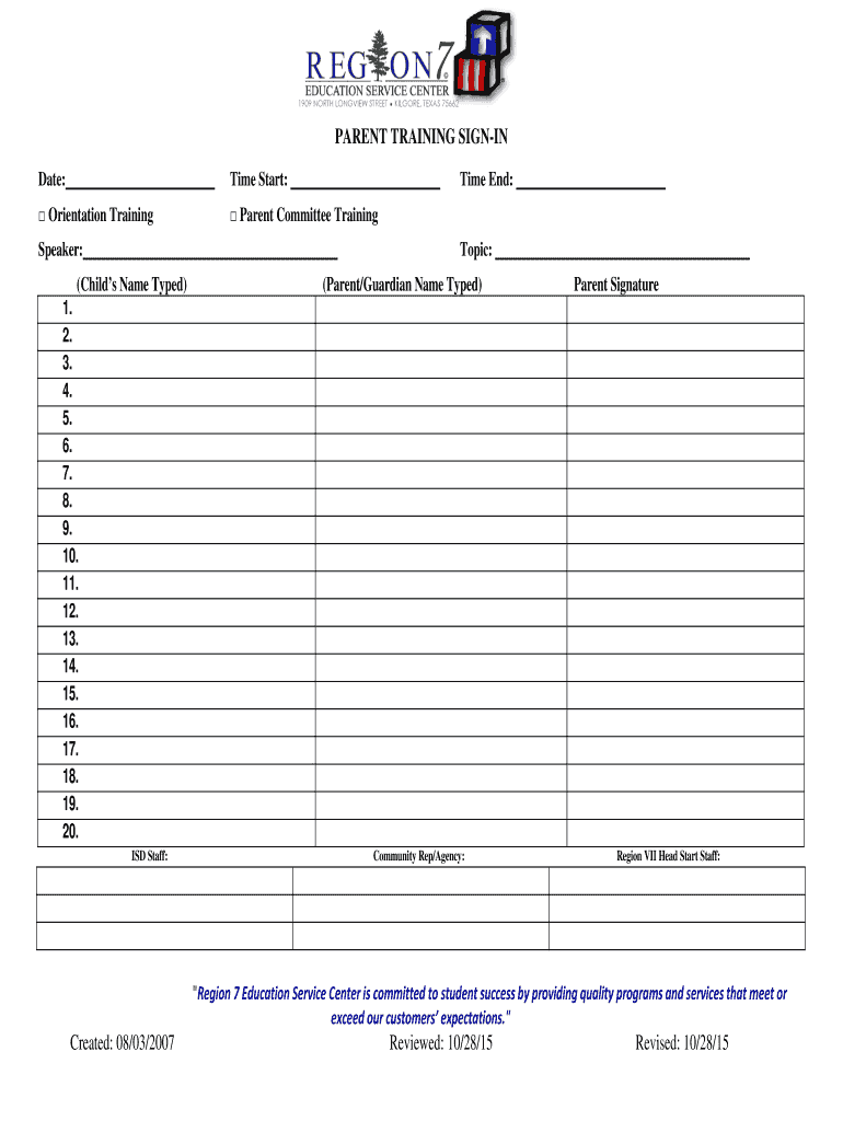 Get the free PARENT TRAINING SIGN-IN - esc7net