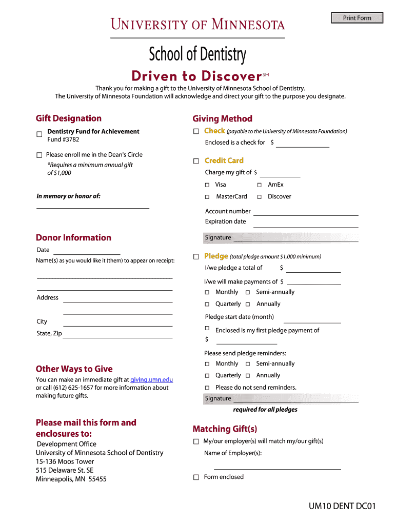 Print Form Thank you for making a gift to the University of Minnesota School of Dentistry. The University of Minnesota Foundation will acknowledge and direct your gift to the purpose you designate.