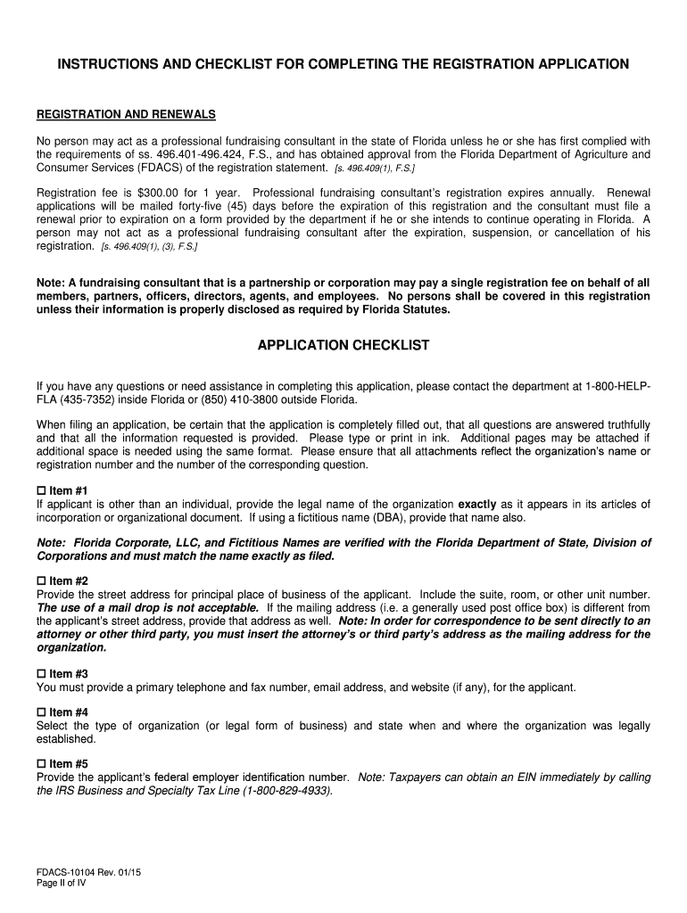 FLORIDA DEPARTMENT OF AGRICULTURE AND CONSUMER SERVICES ADAM H. PUTNAM COMMISSIONER PROFESSIONAL FUNDRAISING CONSULTANT REGISTRATION APPLICATION Chapter 496, Florida Statutes Rule 5J-7.009, Florida