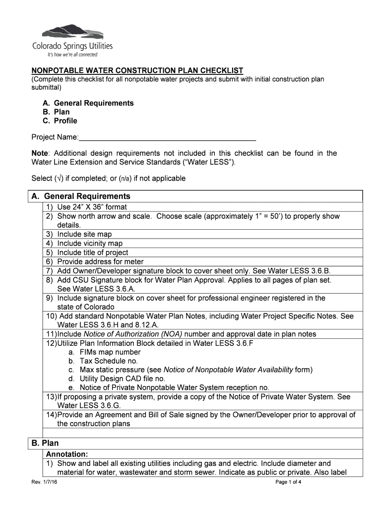Colorado Springs Utilities It's how we're all connected NOTABLE WATER CONSTRUCTION PLAN CHECKLIST (Complete this checklist for all nonpotable water projects and submit with initial construction plan