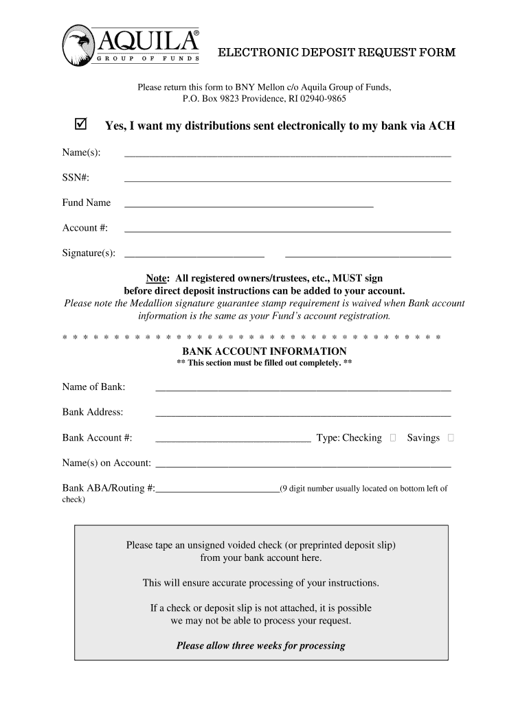 Please return this form to BNY Mellon c/o Aquila Group of Funds, P.O. Box 9823 Providence, RI 029409865 Yes, I want my distributions sent electronically to my bank via ACH Name(s): SSN#: Fund Name