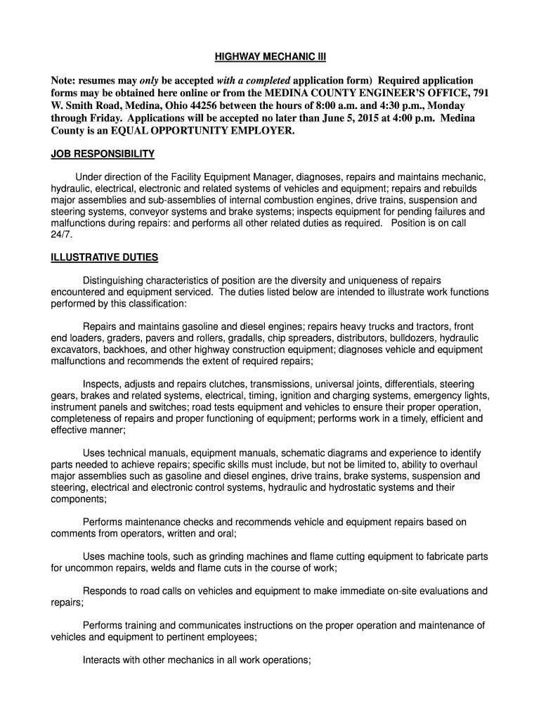 HIGHWAY MECHANIC III Note: resumes may only be accepted with a completed application form) Required application forms may be obtained here online or from the MEDINA COUNTY ENGINEERS OFFICE, 791 W.