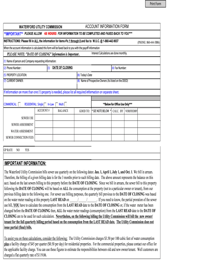 Print Form WATERFORD UTILITY COMMISSION ACCOUNT INFORMATION FORM **IMPORTANT** PLEASE ALLOW 48 HOURS FOR INFORMATION TO BE COMPLETED AND FAXED BACK TO YOU**** INSTRUCTIONS: Please fill in ALL the