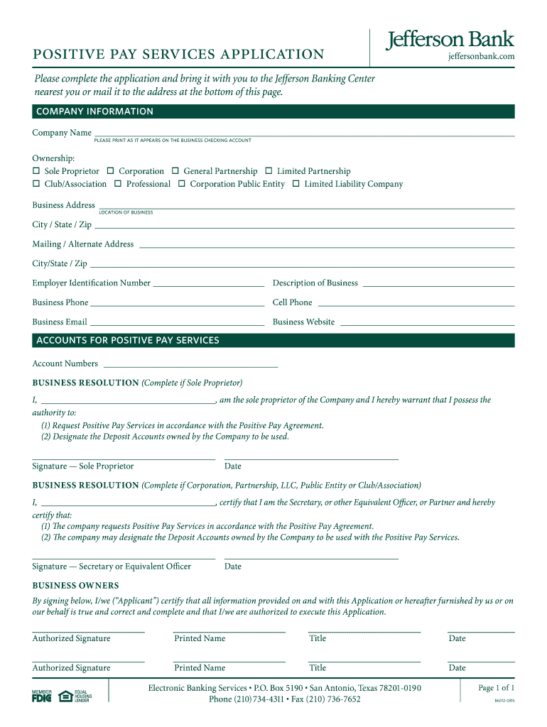 Application instructions Please complete this application and bring it to the Jefferson Banking Center nearest you or mail it to the address at the bottom of the following page. Positive pay services