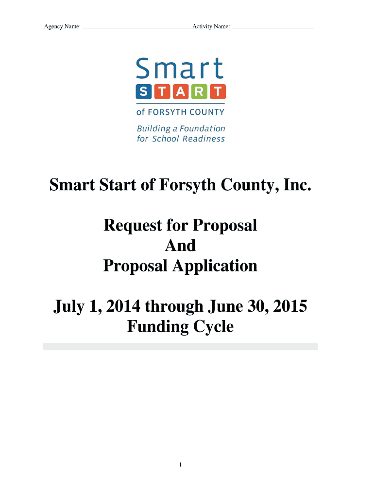 Agency Name: Activity Name: Smart Start of Forsyth County, Inc. Request for Proposal And Proposal Application July 1, 2014, through June 30, 2015, Funding Cycle 1 Agency Name: Activity Name: Request