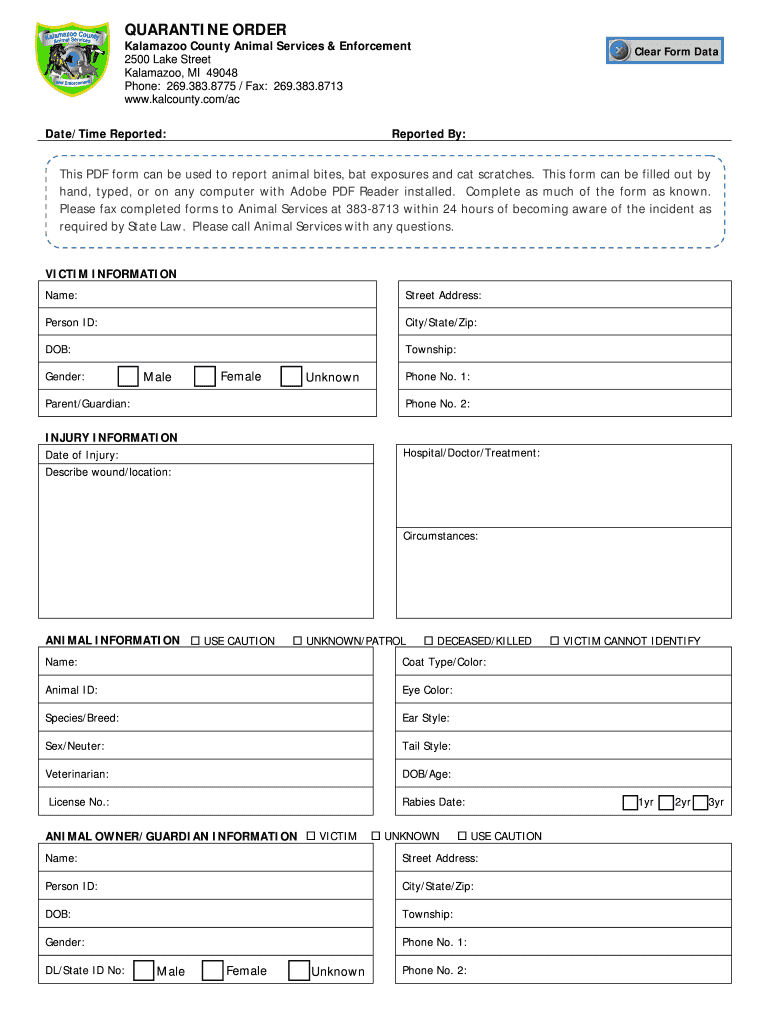 This document is a form used to report incidents related to animal bites, bat exposures, and cat scratches. It includes sections for victim information, injury details, animal information, and owner/guardian