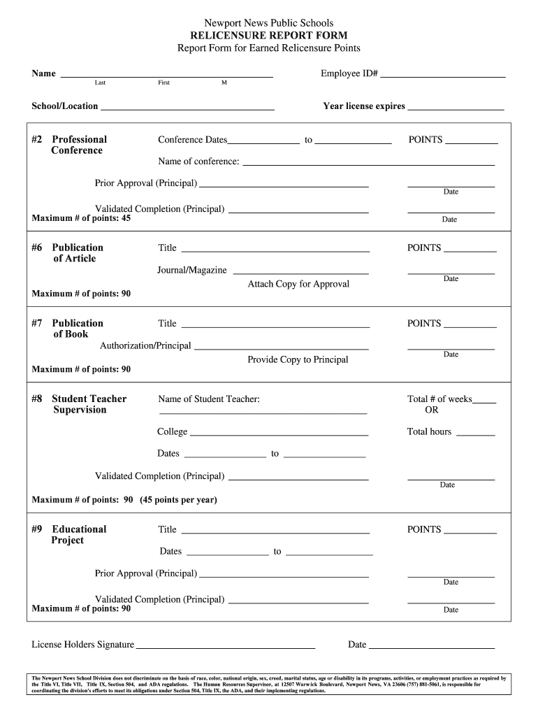 Newport News Public Schools LICENSURE REPORT FORM for Earned Relic ensure Points Name Last First School/Location #2 Professional Conference Employee ID# M Year license expires Conference Dates to