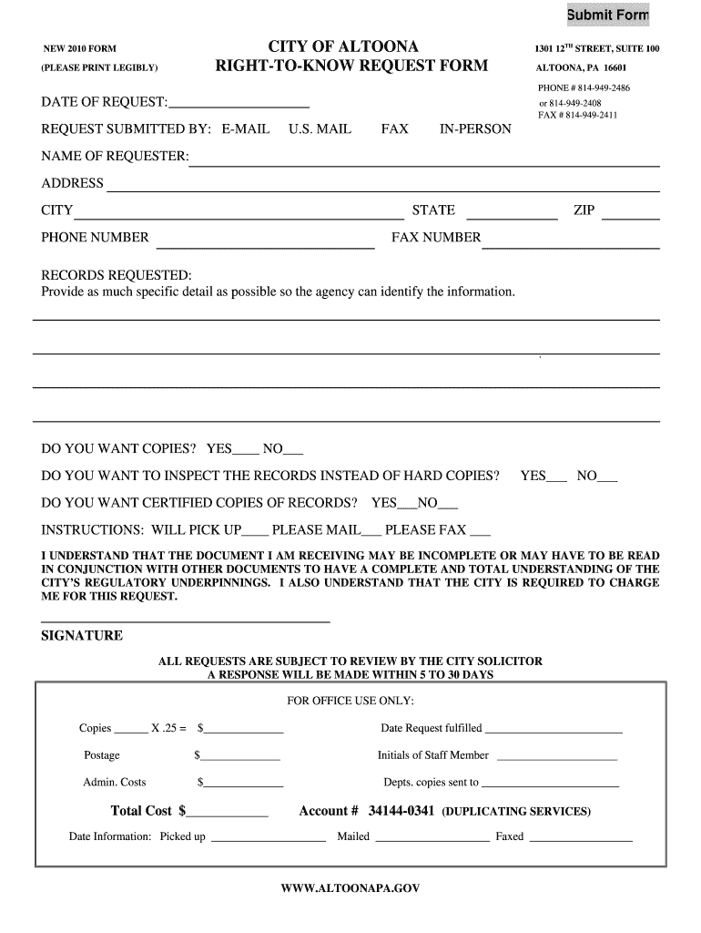 Submit Form CITY OF ALTOONA RIGHTTOKNOW REQUEST FORM NEW 2010 FORM (PLEASE PRINT LEGIBLY) 1301 12TH STREET, SUITE 100 ALTOONA, PA 16601 PHONE # 8149492486 DATE OF REQUEST: or 8149492408 FAX # 8149492411