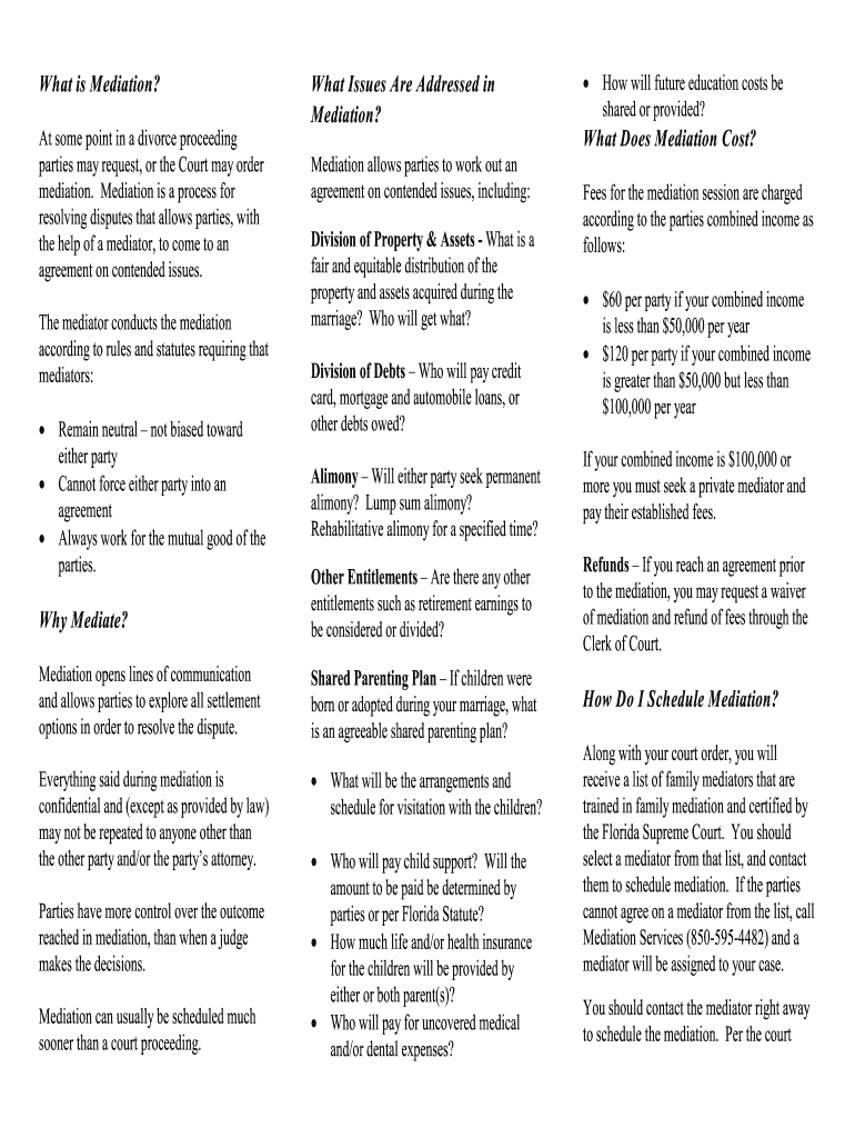 What is Mediation? At some point in a divorce proceeding parties may request, or the Court may order mediation. Mediation is a process for resolving disputes that allows parties, with the help of
