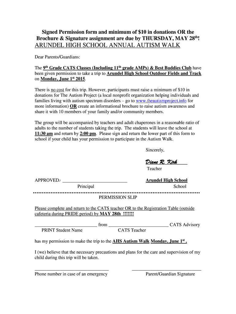 Signed Permission form and minimum of $10 in donations OR the Brochure & Signature assignment are due by THURSDAY, MAY 28th! ROUNDEL HIGH SCHOOL ANNUAL AUTISM WALK Dear Parents/Guardians: The 9th