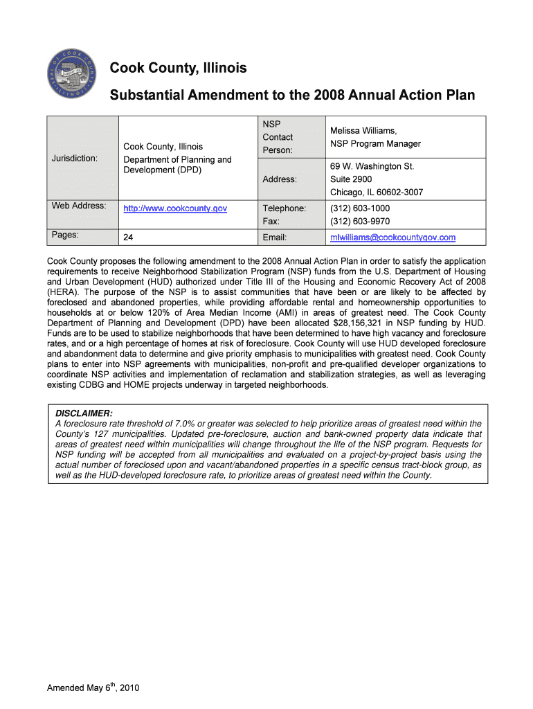 Cook County, Illinois Substantial Amendment to the 2008 Annual Action Plan Jurisdiction: Cook County, Illinois Department of Planning and Development (DPD) NSW Contact Person: Melissa Williams, NSW