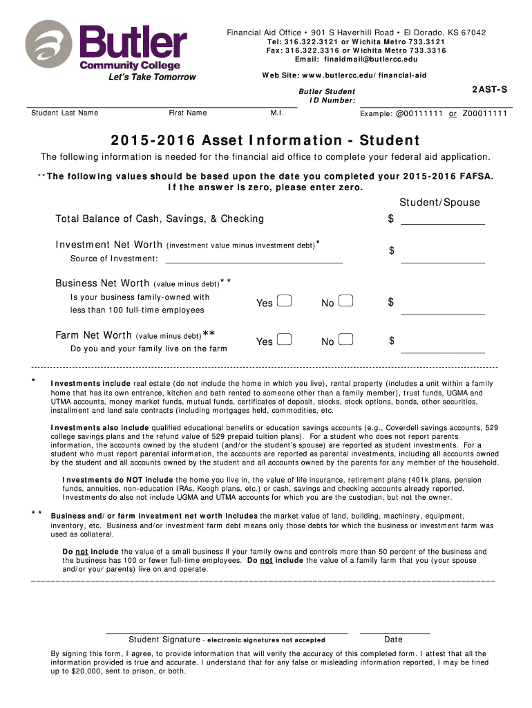 Get the free 2015-2016 Asset Information - Student - documents butlercc