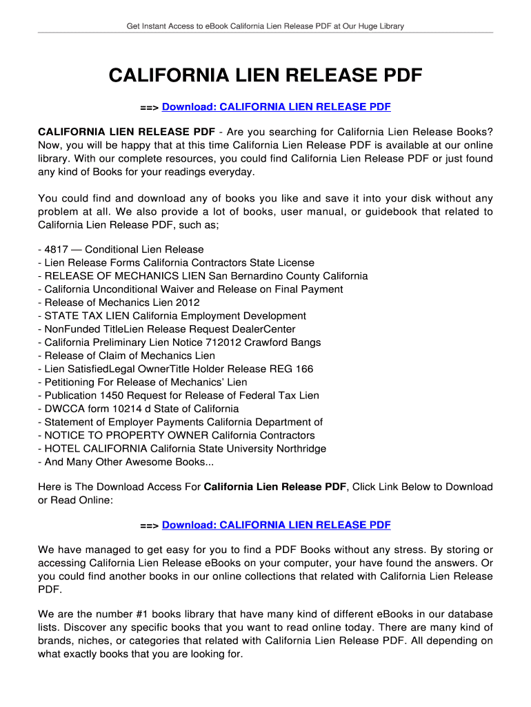 Get Instant Access to e-book California Lien Release PDF at Our Huge Library CALIFORNIA LIEN RELEASE PDF Download: CALIFORNIA LIEN RELEASE PDF CALIFORNIA LIEN RELEASE PDF Are you searching for California