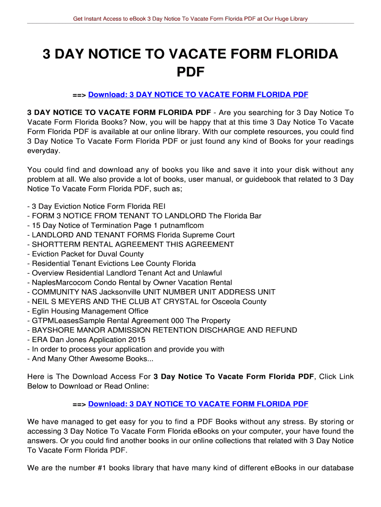 Get Instant Access to e-book 3 Day Notice To Vacate Form Florida PDF at Our Huge Library 3 DAY NOTICE TO VACATE FORM FLORIDA PDF Download: 3 DAY NOTICE TO VACATE FORM FLORIDA PDF 3 DAY NOTICE TO VACATE