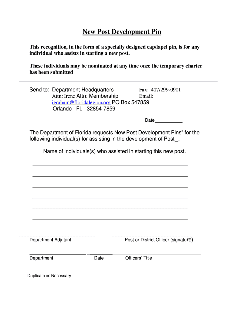 New Post Development Pin This recognition, in the form of a specially designed cap/lapel pin, is for any individual who assists in starting a new post. These individuals may be nominated at any time