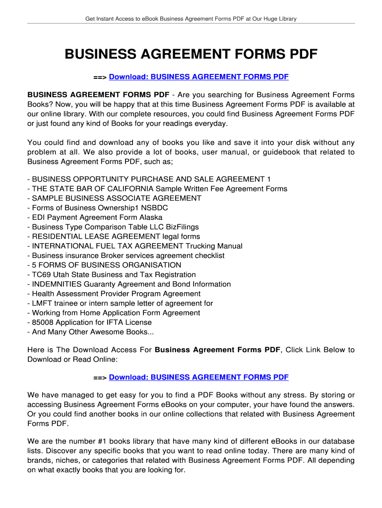 Get Instant Access to e-book Business Agreement Forms PDF at Our Huge Library BUSINESS AGREEMENT FORMS PDF Download: BUSINESS AGREEMENT FORMS PDF BUSINESS AGREEMENT FORMS PDF Are you searching for