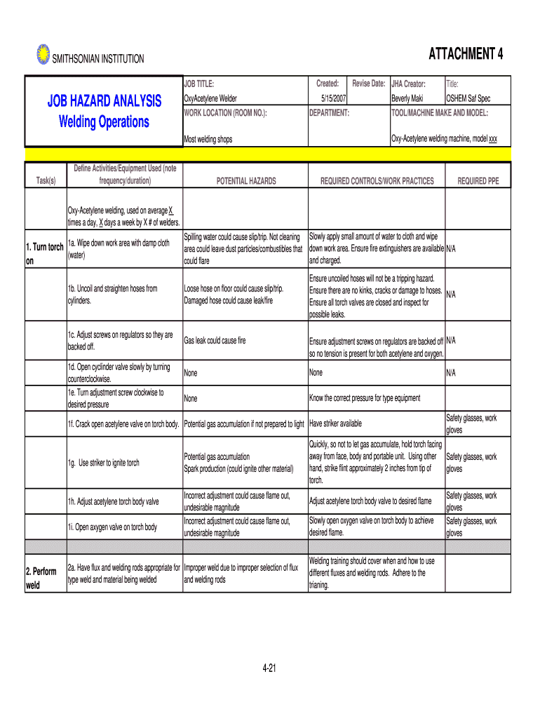 Welding OperationsOxyAcetylene WelderRevise Date:5/15/2007WORK LOCATION (ROOM NO.):DEPARTMENT:Define Activities/Equipment