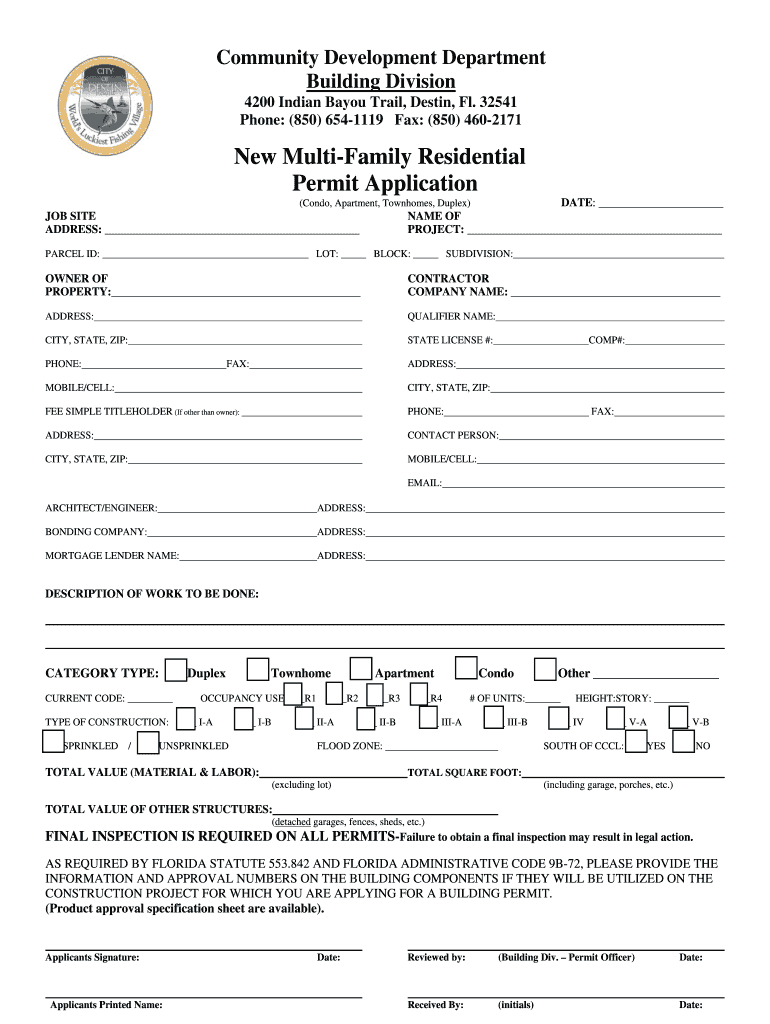 Community Development Department Building Division 4200 Indian Bayou Trail, Destiny, Fl. 32541 Phone: (850) 654-1119 Fax: (850) 460-2171 New Multi-Family Residential Permit Application DATE: NAME