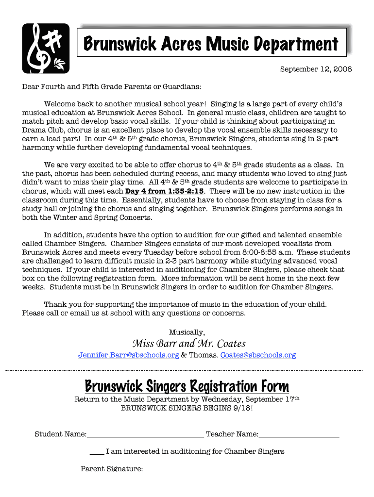 Brunswick Acres Music Department September 12, 2008, Dear Fourth and Fifth Grade Parents or Guardians: Welcome back to another musical school year! Singing is a large part of every child musical education