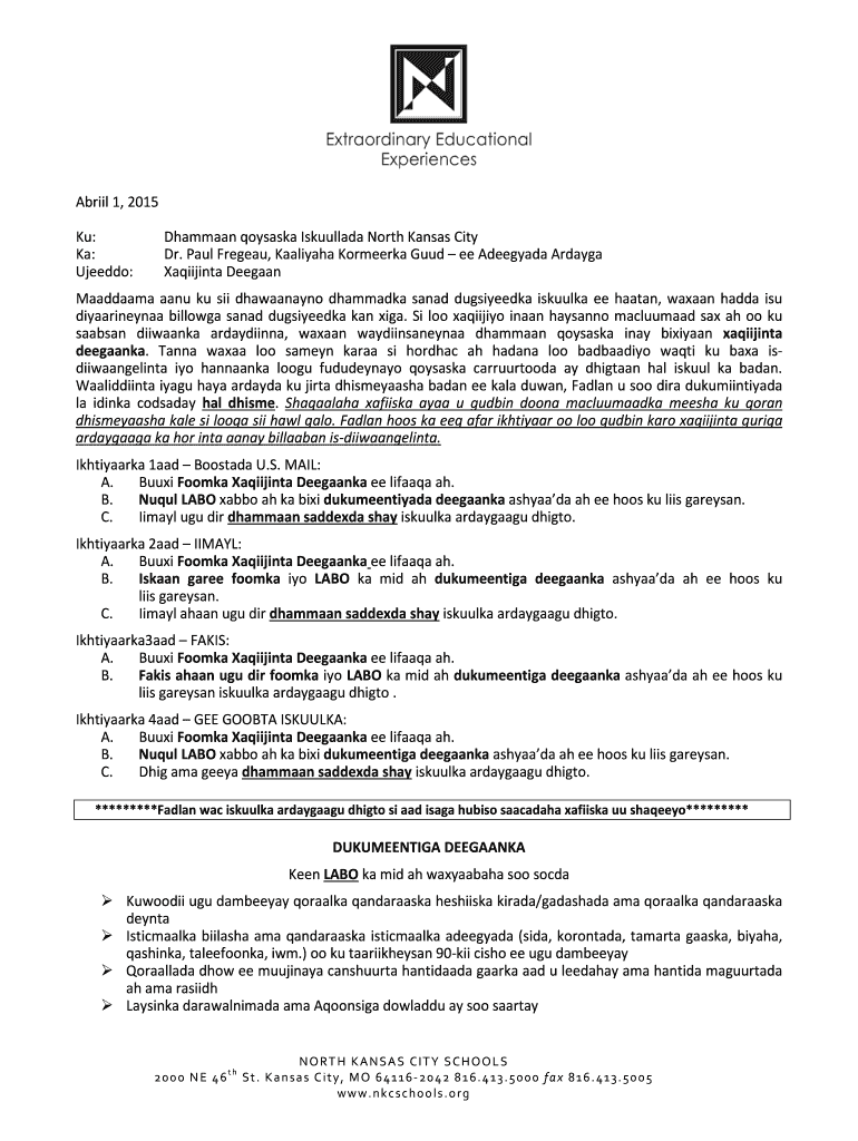 April 1, 2015, KU: Key: Lenddo: Dahomeyan Osaka Iskuullada North Kansas City Dr. Paul Free, Aaliyah Kormeerka GUU EE Adeegyada ADAYG Xaqiijinta Keegan Maaddaama AAU KU SII dhawaanayno dhammadka sand