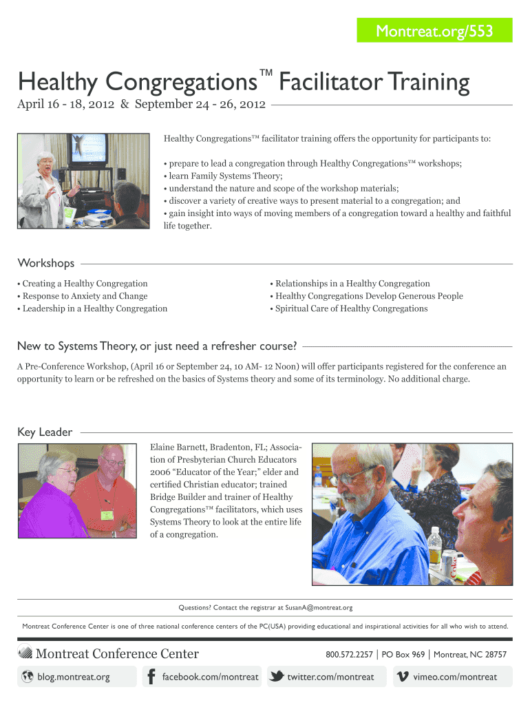 Montreat.org/553 Healthy Congregations Facilitator Training April 16 18, 2012 & September 24 26, 2012 Healthy Congregations' facilitator training offers the opportunity for participants to: prepare