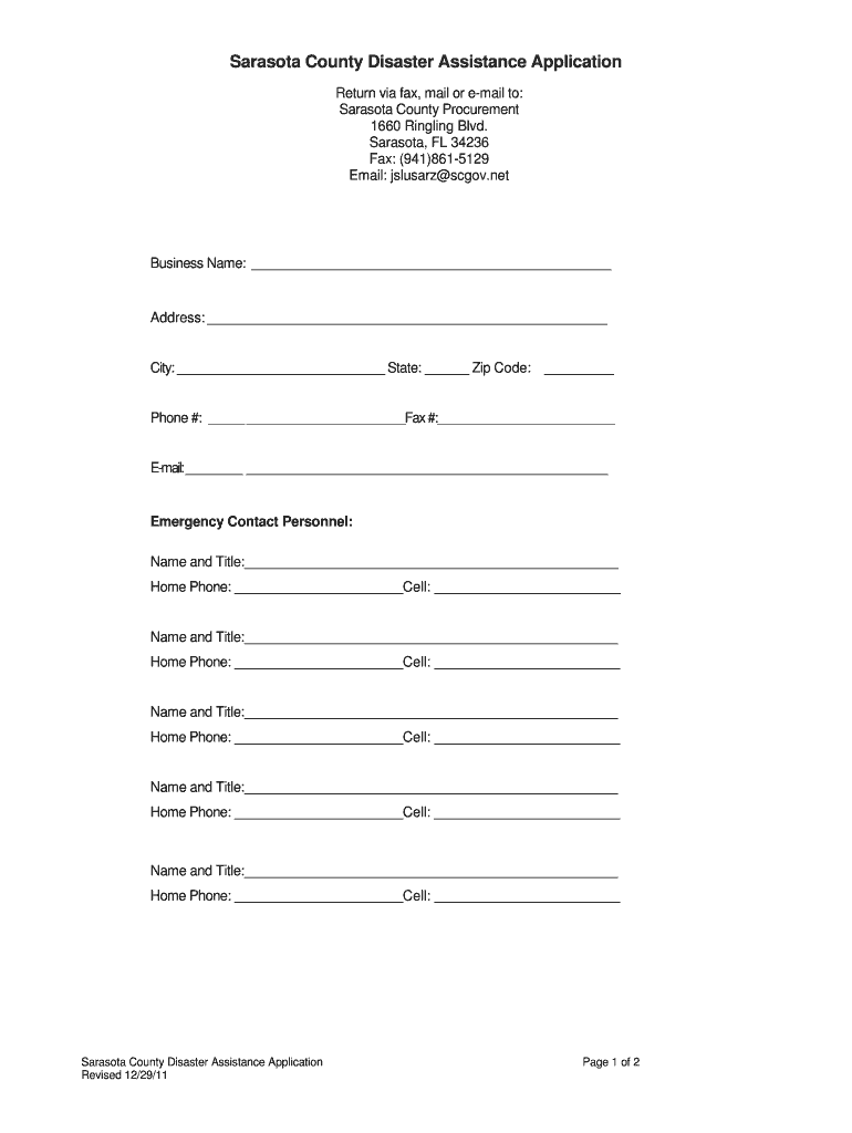 The Sarasota County Disaster Assistance Application is a form that residents can fill out to request financial assistance and support from the county following a disaster or emergency situation.