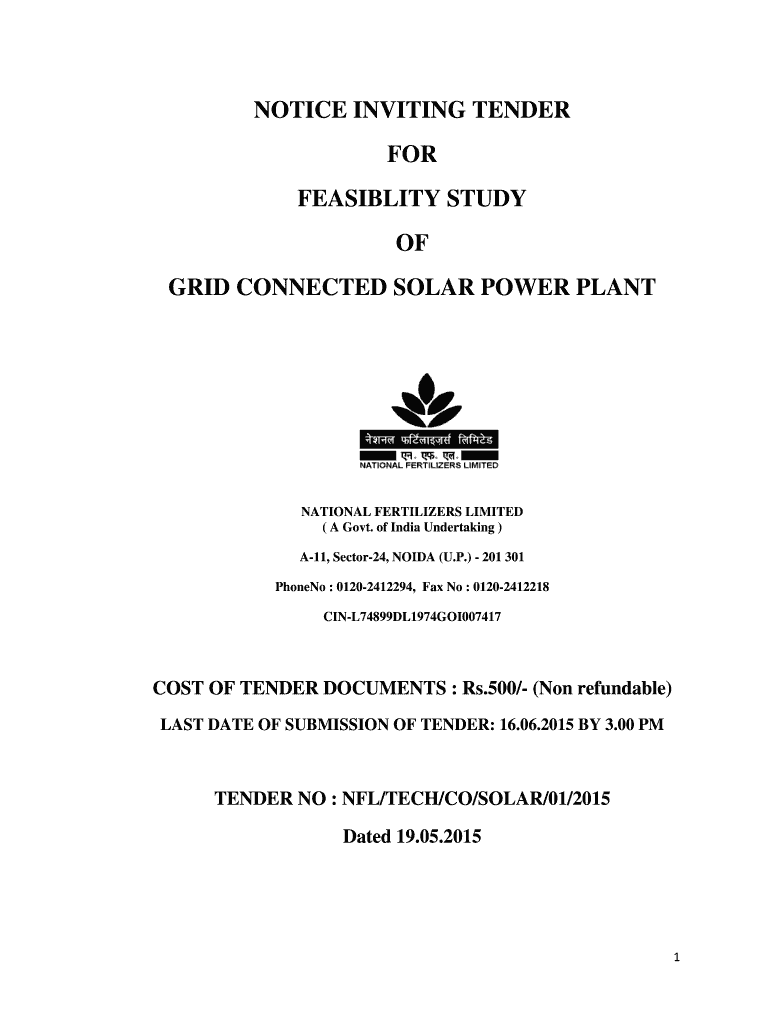 NOTICE INVITING TENDER FOR FEASIBILITY STUDY OF GRID CONNECTED SOLAR POWER PLANT NATIONAL FERTILIZERS LIMITED (A Govt. of India Undertaking) A11, Sector24, NOIDA (U.P.) 201 301 Phone No : 01202412294,