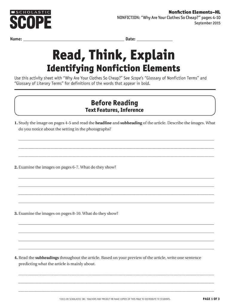Nonfiction Elements HL NONFICTION: Why Are Your Clothes So Cheap? Pages 410 September 2015 THE LANGUAGE ARTS MAGAZINE Name: Date: Read, Think, Explain Identifying Nonfiction Elements Use this activity