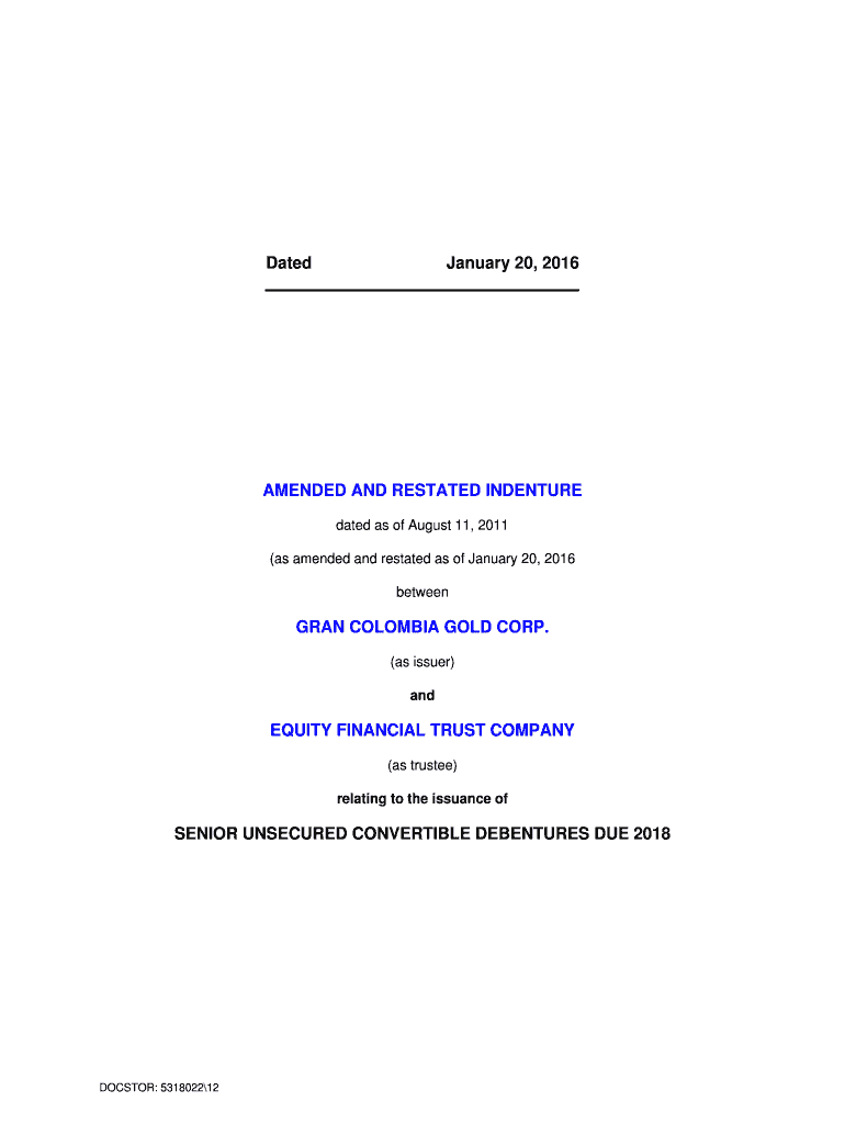 Dated January 20, 2016, AMENDED AND RESTATED INDENTURE dated as of August 11, 2011 (as amended and restated as of January 20, 2016, between GRAN COLOMBIA GOLD CORP. (as issuer) and EQUITY FINANCIAL