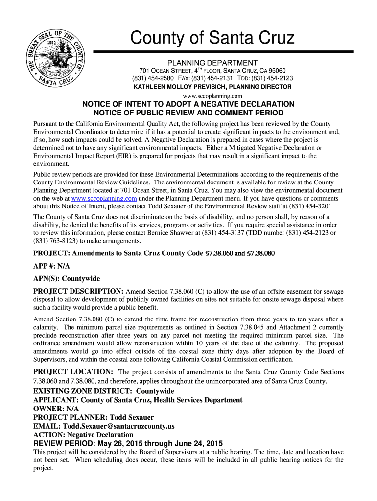County of Santa Cruz PLANNING DEPARTMENT TH 701 OCEAN STREET, 4 FLOOR, SANTA CRUZ, CA 95060 (831) 4542580 FAX: (831) 4542131 TDD: (831) 4542123 KATHLEEN MOLLY PREVISION, PLANNING DIRECTOR www.sccoplanning.com