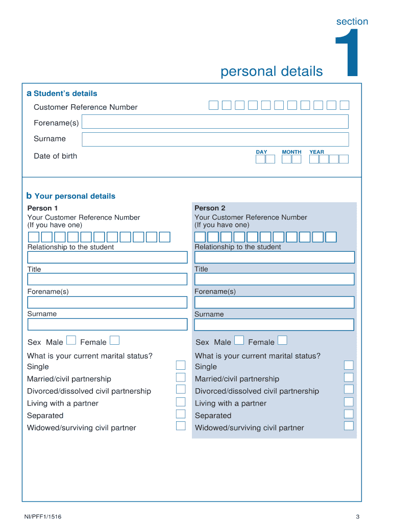 PFF1 Assessment of financial circumstances 2015/16 This form is also available at www.studentfinanceni.co.uk NI/PFF1/1516/A 1 Who should complete this form? Complete this form if you are: The students