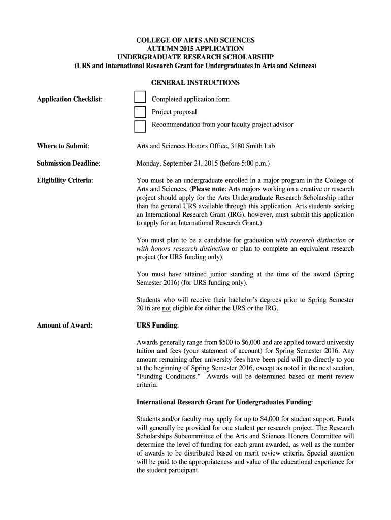 COLLEGE OF ARTS AND SCIENCES AUTUMN 2015 APPLICATION UNDERGRADUATE RESEARCH SCHOLARSHIP (URS and International Research Grant for Undergraduates in Arts and Sciences) GENERAL INSTRUCTIONS Application
