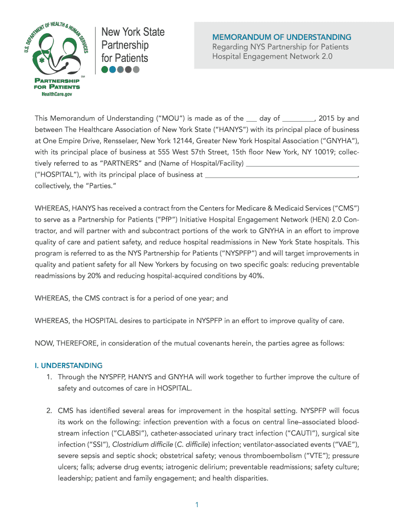 New York State Partnership for Patients MEMORANDUM OF UNDERSTANDING Regarding NYS Partnership for Patients Hospital Engagement Network 2.0 This Memorandum of Understanding (YOU) is made as of the