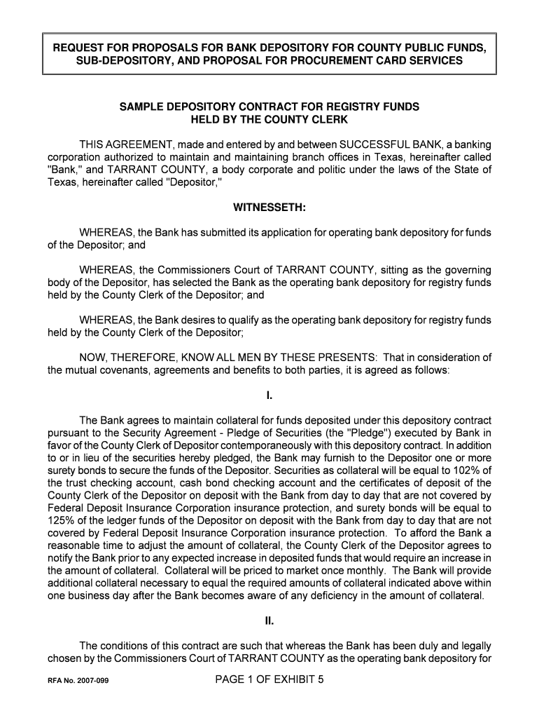 This document outlines the agreement between Successful Bank and Tarrant County for the management of public funds held by the County Clerk, including terms of deposits, interest payments, overdraft