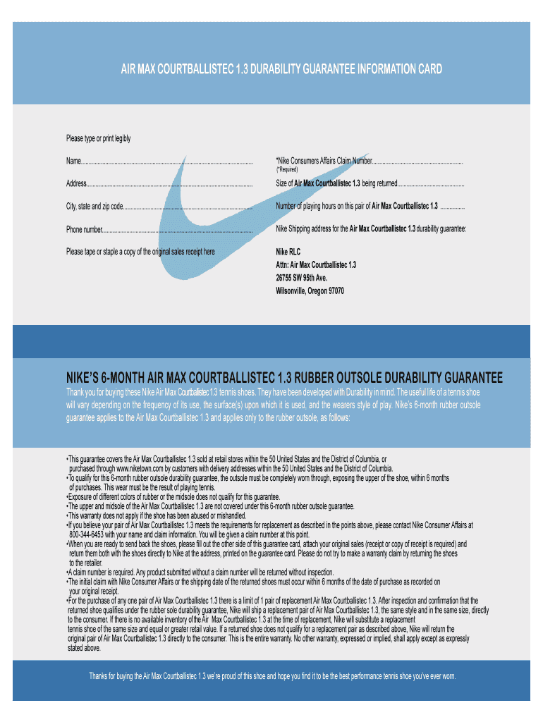 AIR MAX COURTBALLISTEC 1.3 DURABILITY GUARANTEE INFORMATION CARD Please type or print legibly Name.................................................................................................................