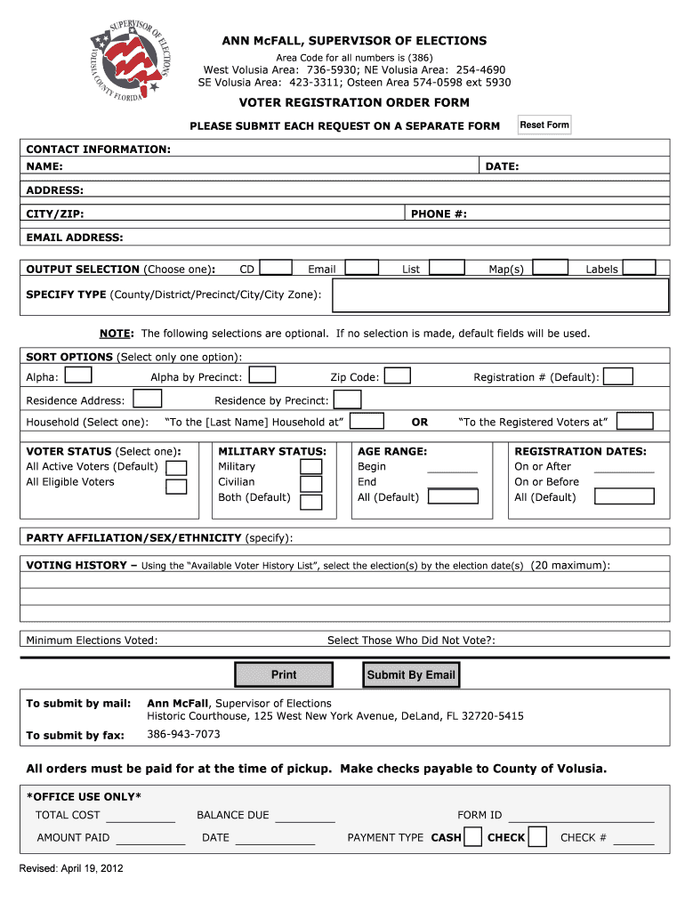 The completed Voter Registration Order Form must be submitted by mail or fax to the Supervisor of Elections in Volusia County. Ensure that all required fields are filled and payment is made at the time of pickup.