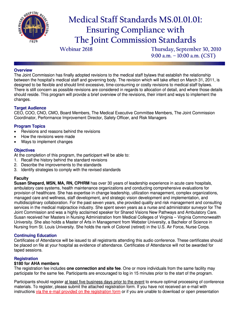 Medical Staff Standards MS.01.01.01: Ensuring Compliance with The Joint Commission Standards Webinar 2618 Thursday, September 30, 2010 9:00 a.m. 10:00 a.m. (CST) Overview The Joint Commission has