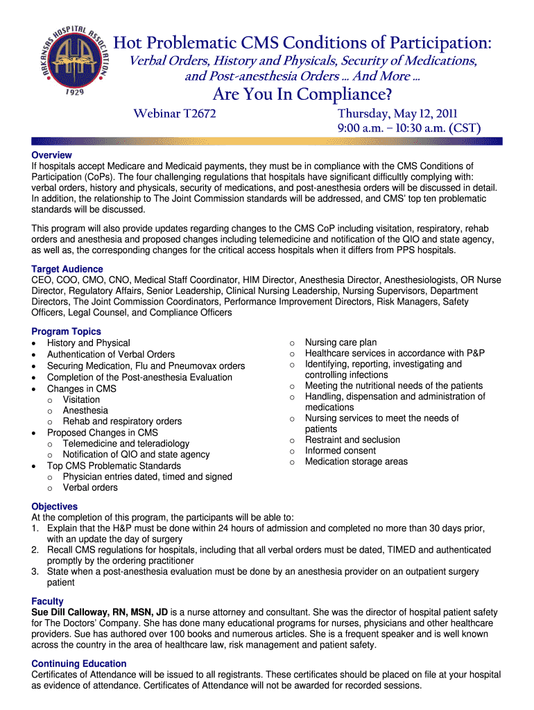Hot Problematic CMS Conditions of Participation: Verbal Orders, History and Physicals, Security of Medications, and Postanesthesia Orders And More Are You In Compliance? Webinar T2672 Thursday, May