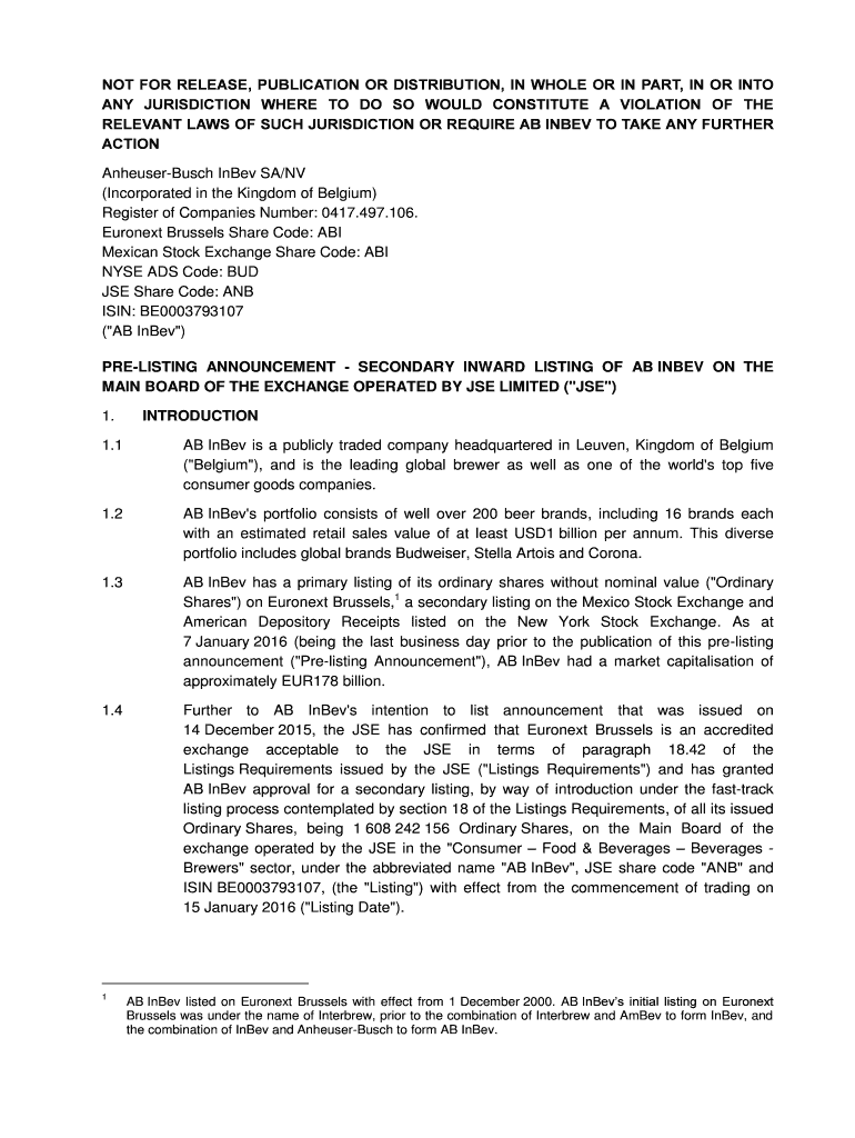 NOT FOR RELEASE, PUBLICATION OR DISTRIBUTION, IN WHOLE OR IN PART, IN OR INTO ANY JURISDICTION WHERE TO DO SO WOULD CONSTITUTE A VIOLATION OF THE RELEVANT LAWS OF SUCH JURISDICTION OR REQUIRE AB INBEV