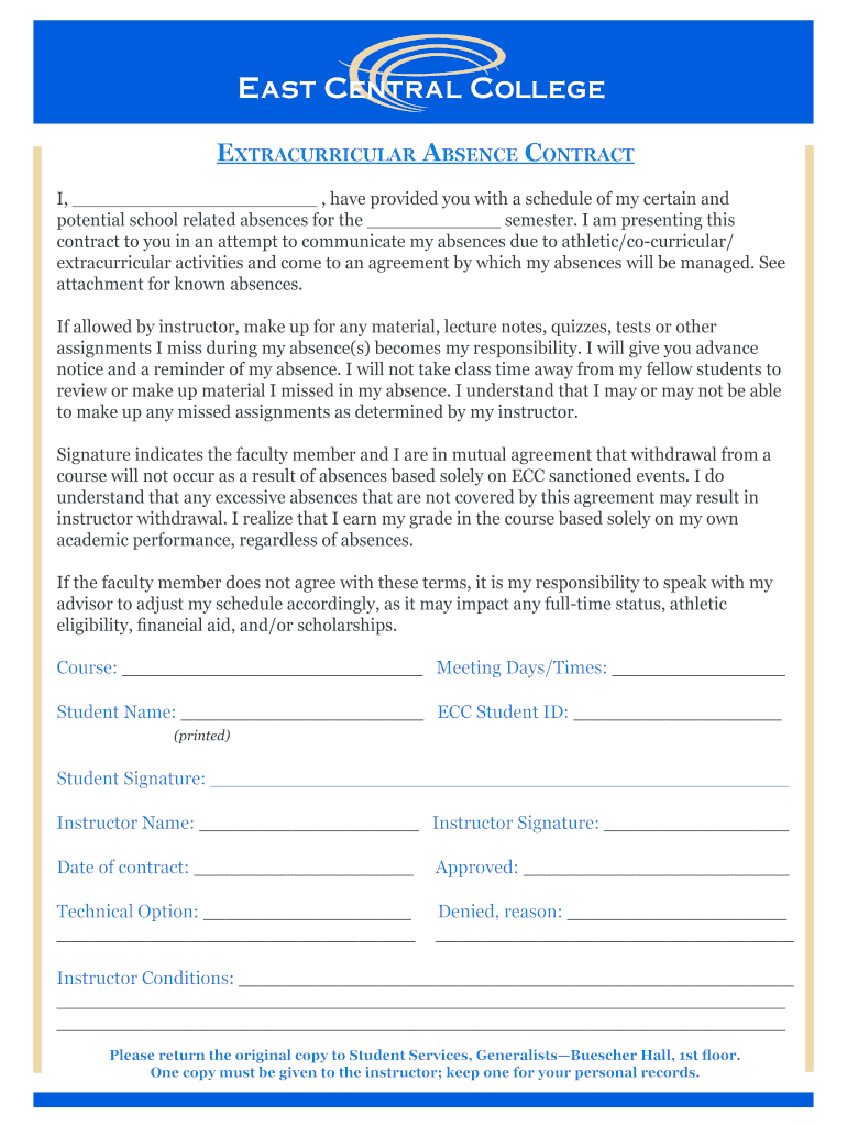 Students who participate in extracurricular activities that require absences from regular academic classes may need an extracurricular absence contract.