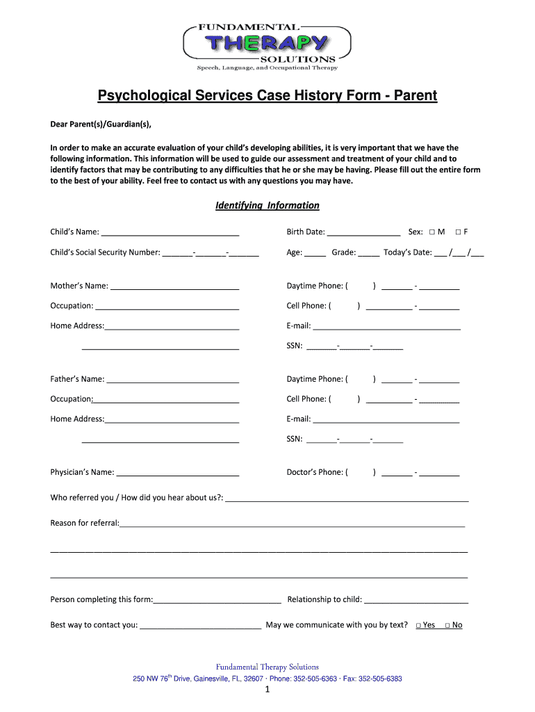 Psychological Services Case History Form Parent Dear Parent(s)/Guardian(s), In order to make an accurate evaluation of your children developing abilities, it is very important that we have the following
