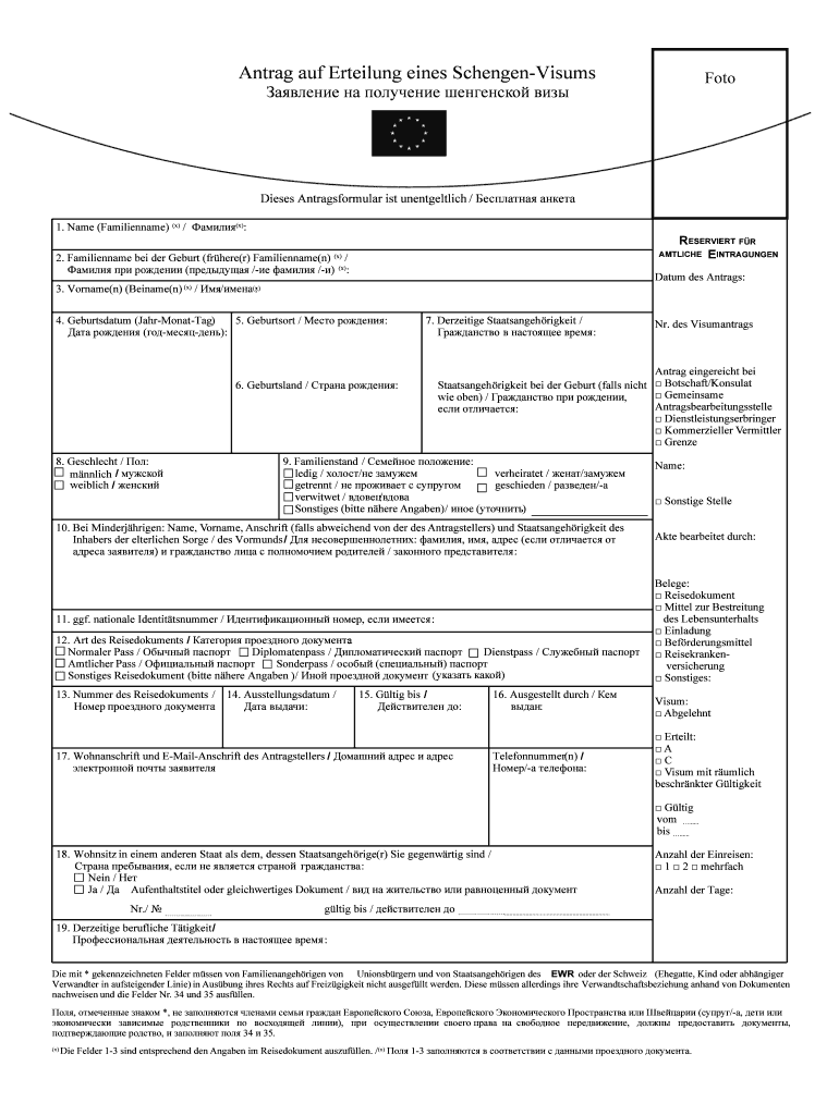 Ant rag AUF Derailing lines Schengen-Visums Foot Daises Antragsformular is unentgeltlich / 1. Name (Familienname) (x) / (x): RESERVIST F R EINTRAGUNGEN ARTICLE 2. Familienname BEI her Debut (for here(r)