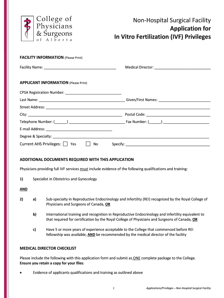 Hospital Surgical Facility Application for In Vitro Fertilization (IVF) Privileges FACILITY INFORMATION (Please Print) Facility Name: Medical Director: APPLICANT INFORMATION (Please Print) CPA Registration